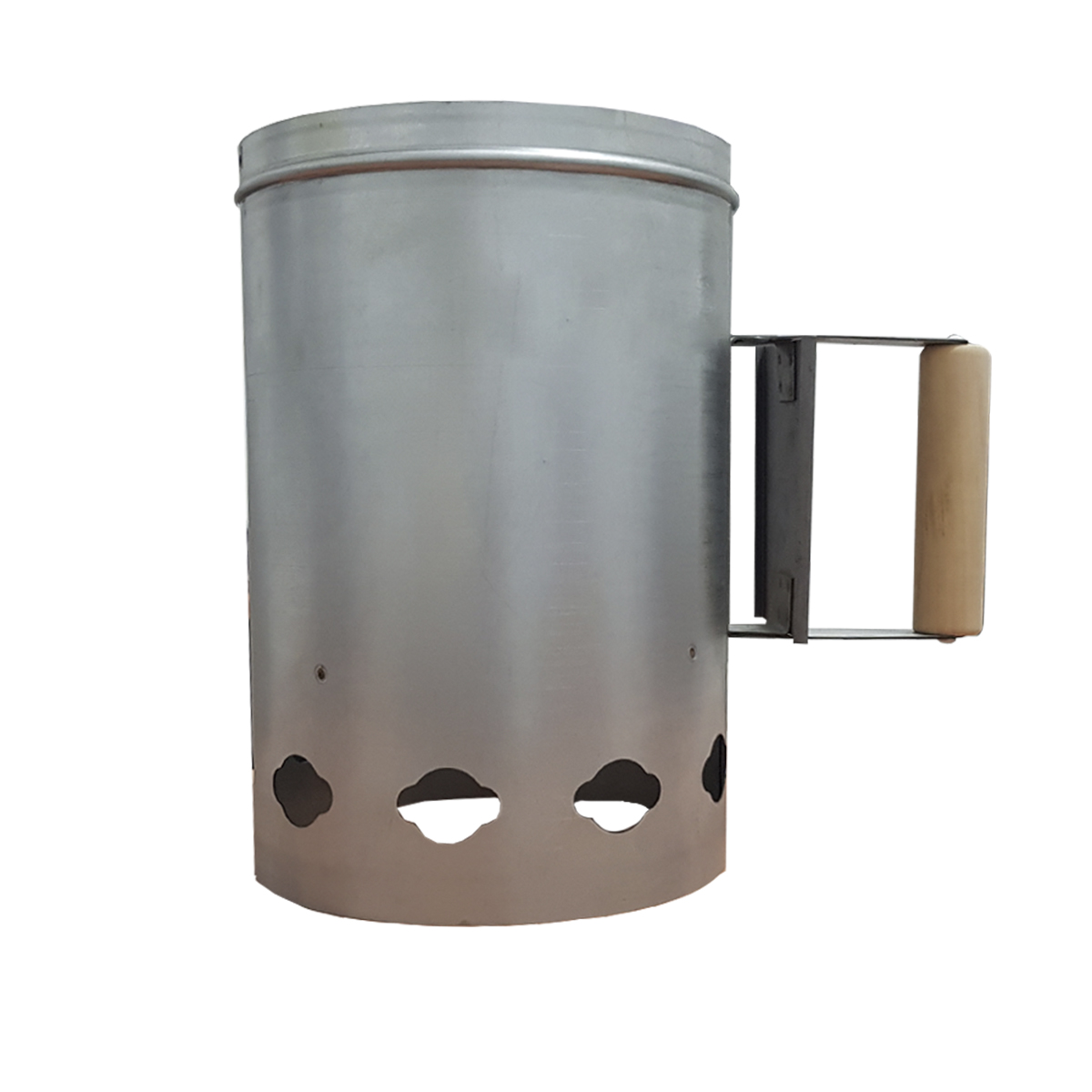 Cilindro metálico construído en chapa de hierro, con asa de madera, liviano, y fácil de transportar y utilizar.