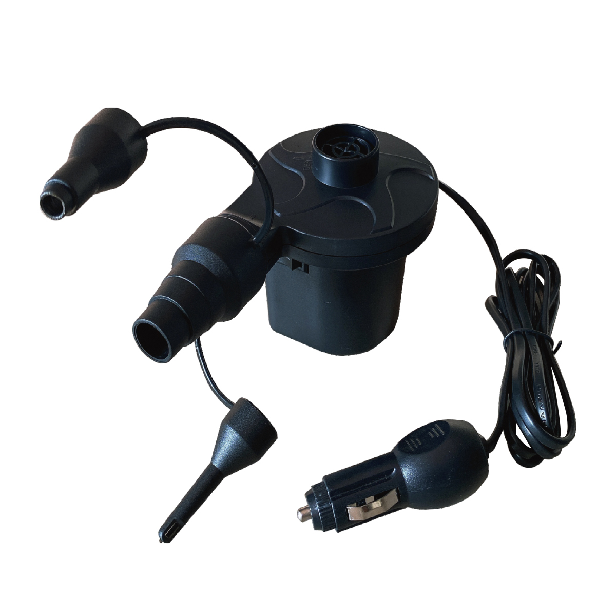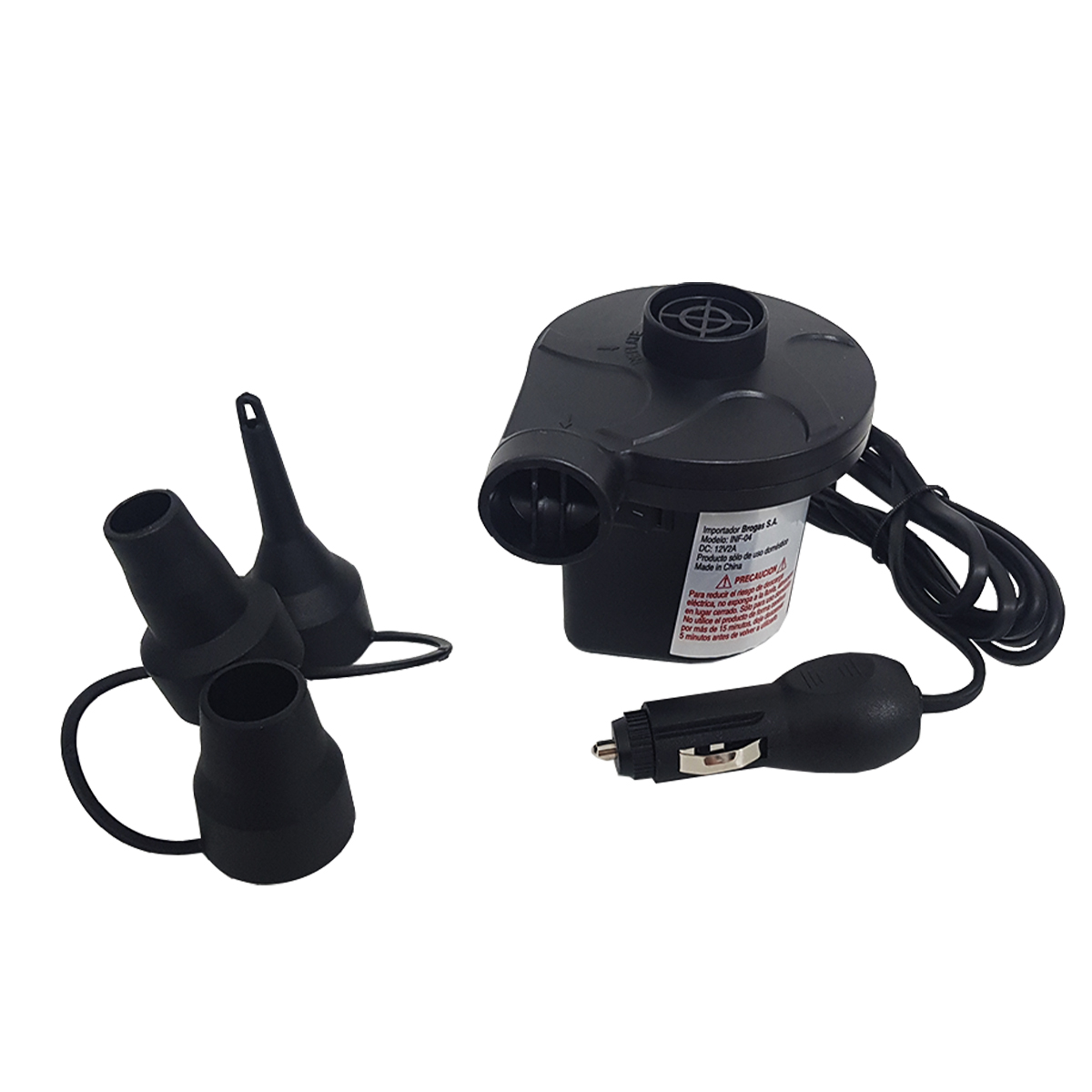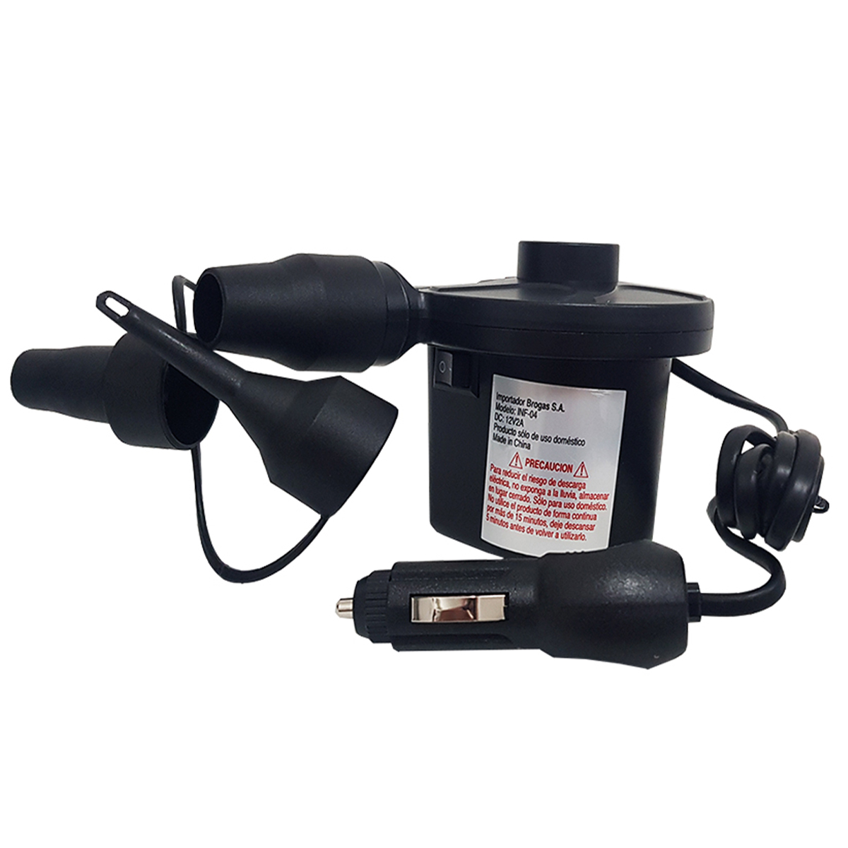 Inflador 12 Volts, Infla y desinfla con 3 adaptadores.