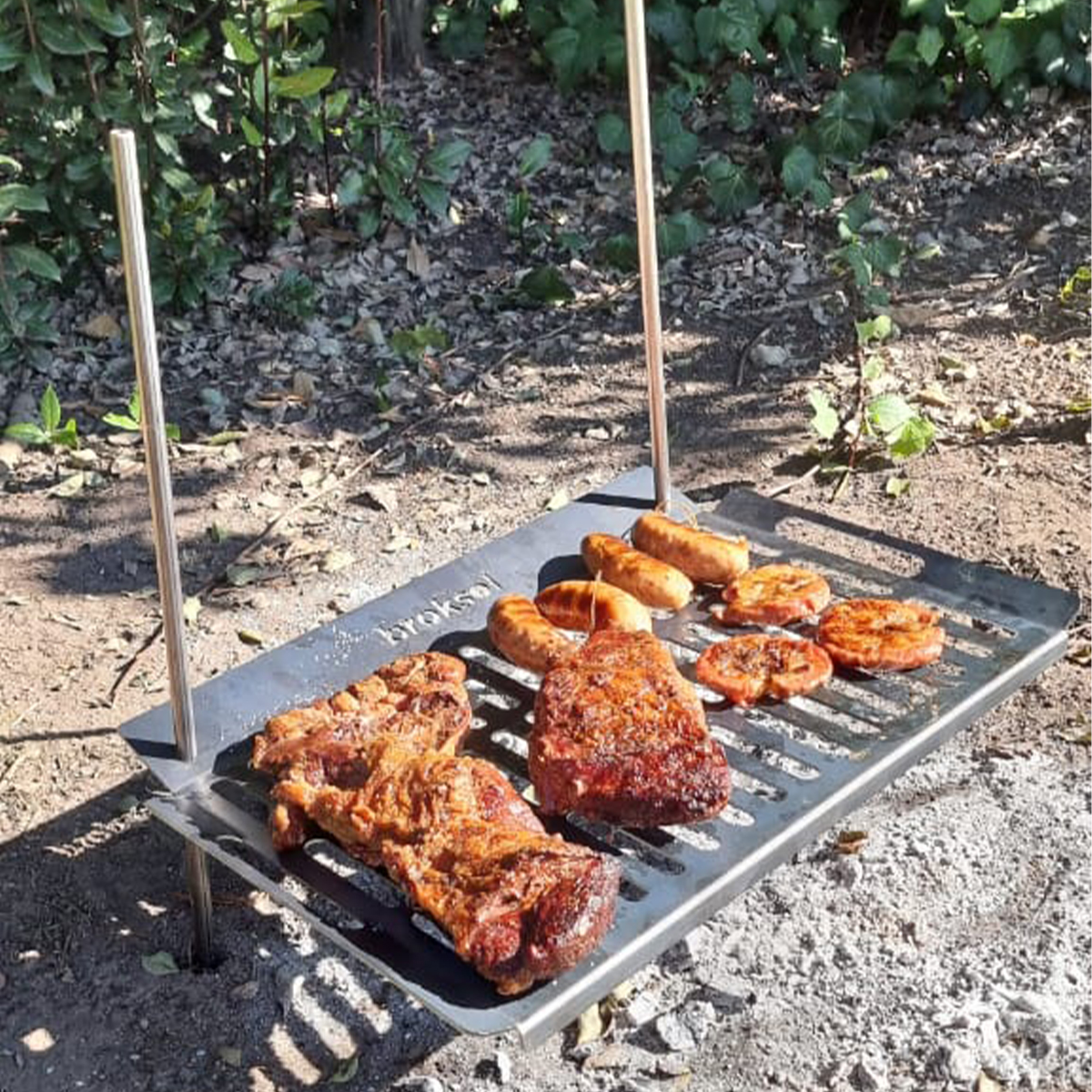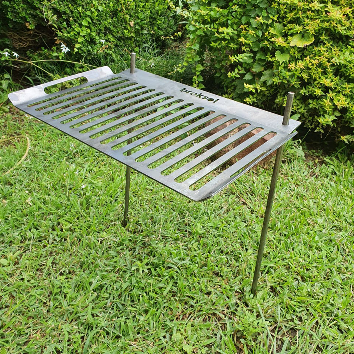 Incluye 3 piezas de chapa negra reforzada, que constan de un emparrillado en chapa de 2,5 mm de espesor súper resistente, y 2 varillas que permiten clavar la parrilla en el lugar que desees.